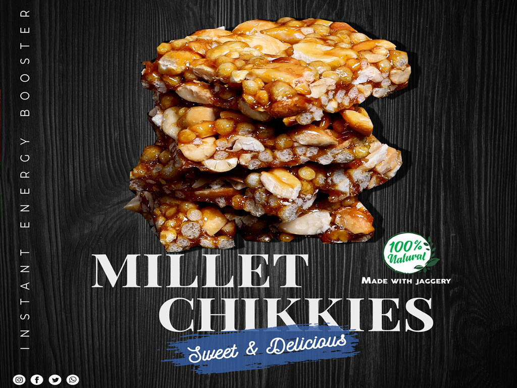 Instant Energy Booster Chikki Loaded With 8 Millets (Little millet , Kodo Millet , Pearl millet Banyard Millet , Foxtail Millet , Finger Millet Proso Millet , Sorghum) Made With Organic Jaggery SORGHUM/JOWAR/CHOLAM One of the ancient cereal grains with high nutritional value, high levels of unsaturated fats, protein fibre and minerals like phosphorous, potassium, calcium and iron.Sorghum helps to improve metabolism. PROSO MILLET Proso millet contains high lecithin which supports the neural health system. It is rich in vitamins (niacin, B-complex vitamins, folic acid), minerals (P, Ca, Zn, Fe) and essential amino acids (methionine and cysteine). It has a low glycemic index and reduces the risk of type-2 diabetes