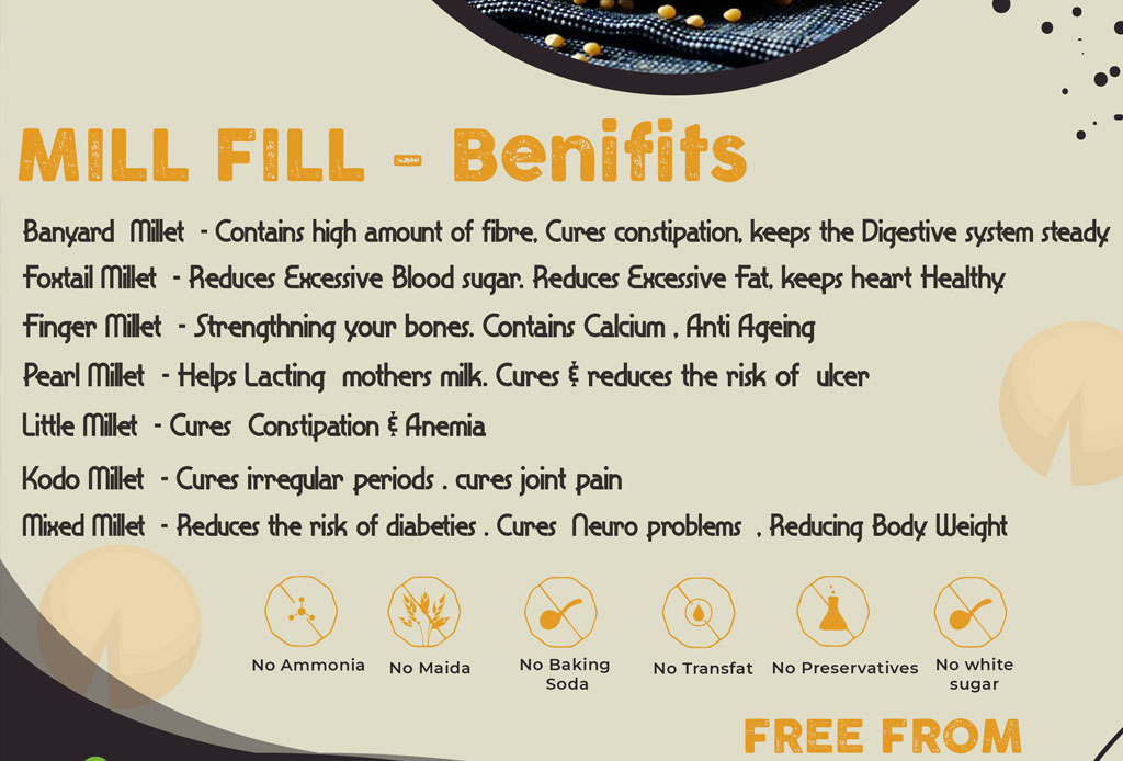 Millet is a dietary staple and the main source of protein in most of the developing world. Globally, millet is the sixth most cultivated grain. Millet(Satvik, Nutraceutical, Organic, Ancient, Healthy, Wellness grains) Millets are called ‘sridhanya’ meaning rich grains refreshing to their nutritional value. They can fill the nutritional gaps when one’s diet is predominantly non-vegetarian. In terms of nutritional value, millets can supersede rice and wheat. Millets are an extremely good source of fiber and protein when compared with white rice. They are rich in iron, copper, manganese, calcium, phosphorous, magnesium and B vitamins. They also contain antioxidants, flavonoids, certain amino acids and tryptophan. Millets in our diet ensure glycerin control which in turn is effective against diabetes. They can lower the risk of Type 2 diabetes. Millets are heart friendly and good in atherosclerosis. They do a lot of good to people suffering from hypothyroidism and women suffering from the polycystic ovarian disease. Millets also improve muscle and nerve health. A small quantity of millets gives satiety and thus prevents an increase in weight. This is a blessing for those who suffer from obesity.
